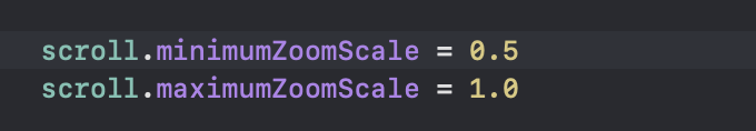 -줌잉을 완료했을 때의 scale정보를 나타나게 되는데 스크롤 뷰 객체의 maximumZoomScale, minimumZoomScale프로퍼티 제한을 두었으므로 이 값 사이의 값들이 출력을 하게 됩니다.