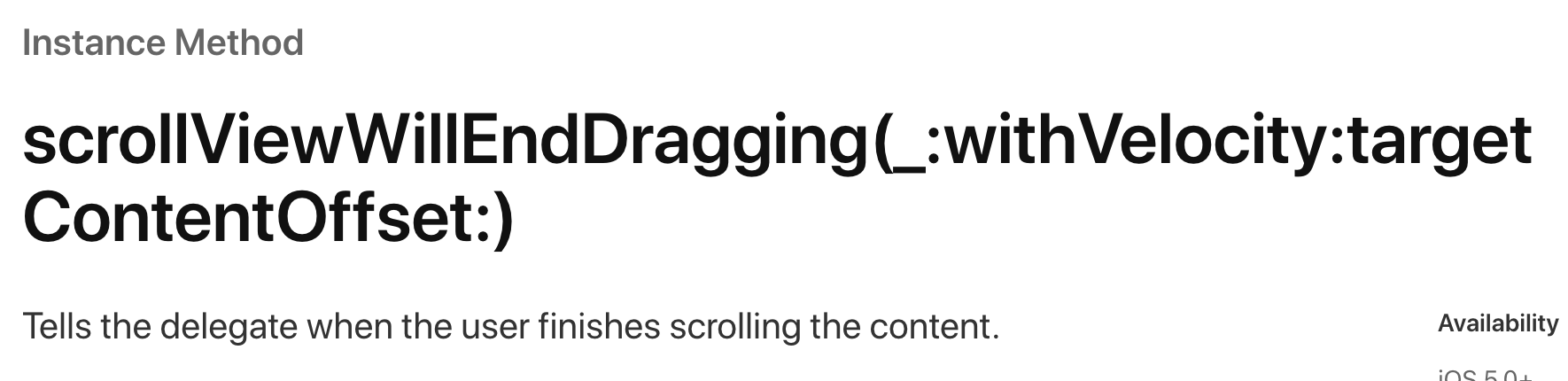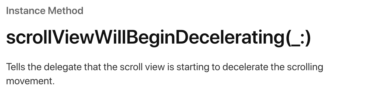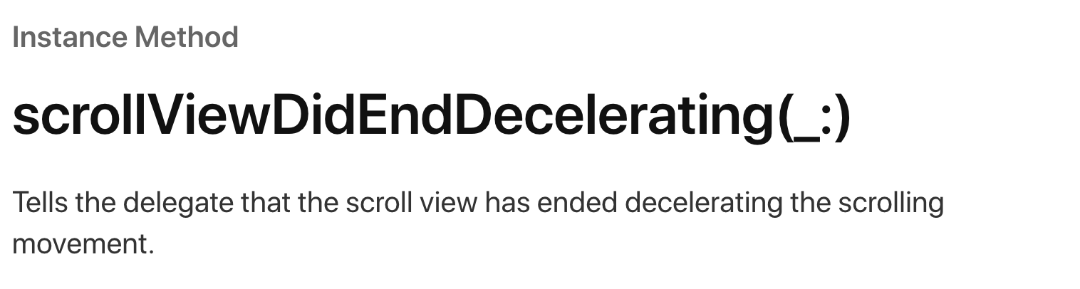 - decelerate - Bool형으로 만약 사용자가 터치를 놨는데 현재 스크롤링이 끝났으면 false 그렇지 않고 계속 스크롤 중이면 true를 반환합니다.