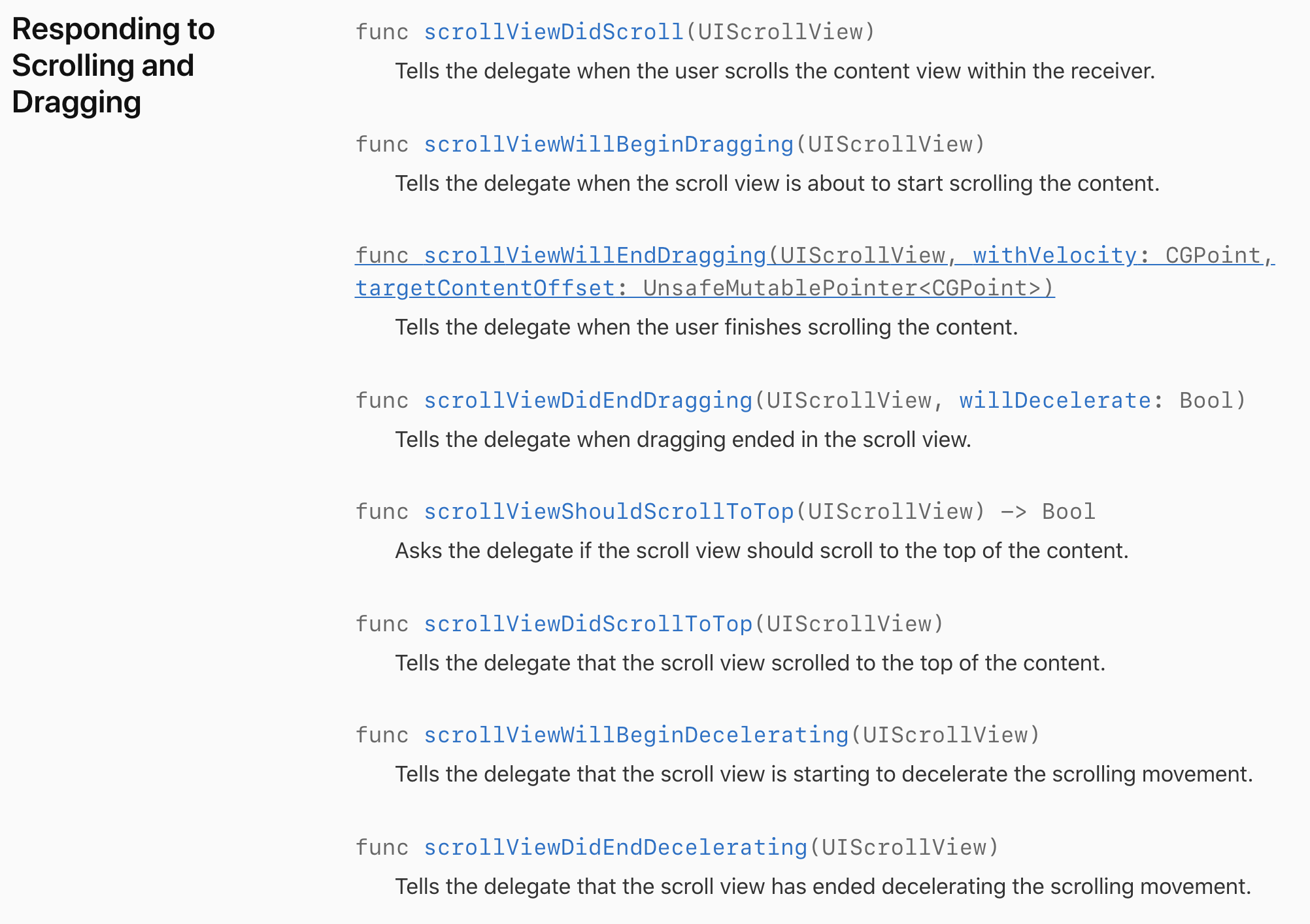 애플 공식문서에 나와있는 UIScrollViewDelegate에 대해 의미를 한번 알아봐야겠죠? ㅎㅎㅎ