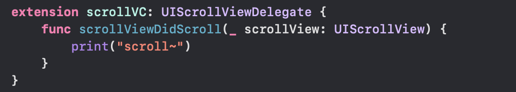 저는 해당 델리게이트 메소드에 기본적으로 스크롤 발생할 때마다 콘솔 창에 scroll~~ 이라는 로그가 찍히도록 설정해주었습니다.