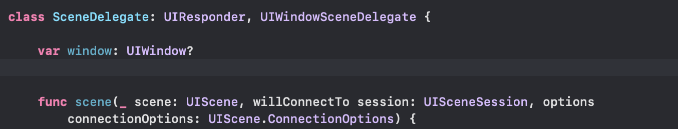 간단하게 SceneDelegate클래스는 UI라이프 사이클을 관리해주는 클래스라고 보시면 됩니다. iOS13 버전 이전에는 AppDelegate에서 라이프 사이클을 관리해줬지만 그 이후에는 앱 하나에 여러 개의 window를 사용할 수 있게 하기 위해 SceneDelegate에서 라이프 사이클을 관리하도록 빼놓았습니다.