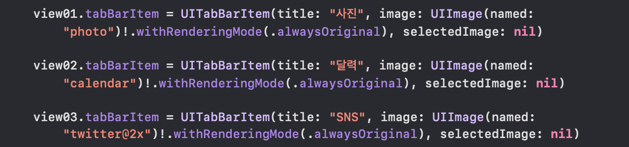 UITabBarItem은 탭바 아이템의 클래스로 Initalize를 통해서 탭바 아이템의 타이틀, 이미지, 선택했을 때 이미지를 설정을 해줄 수 있습니다.