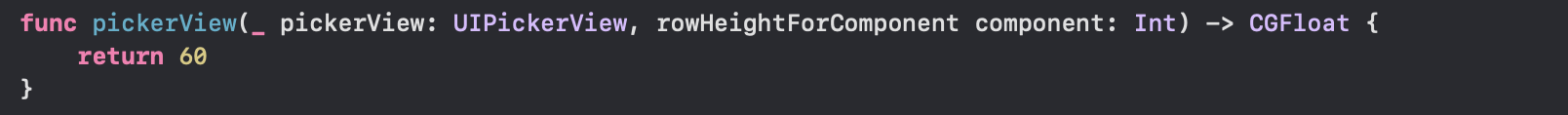 - pickerView(_:titleForRow:) 델리게이트 메서드는 피커뷰의 아이템을 설정해주는 메서드로 각 피커뷰의 아이템 값들에 row을 통해 index를 설정하게 됩니다.