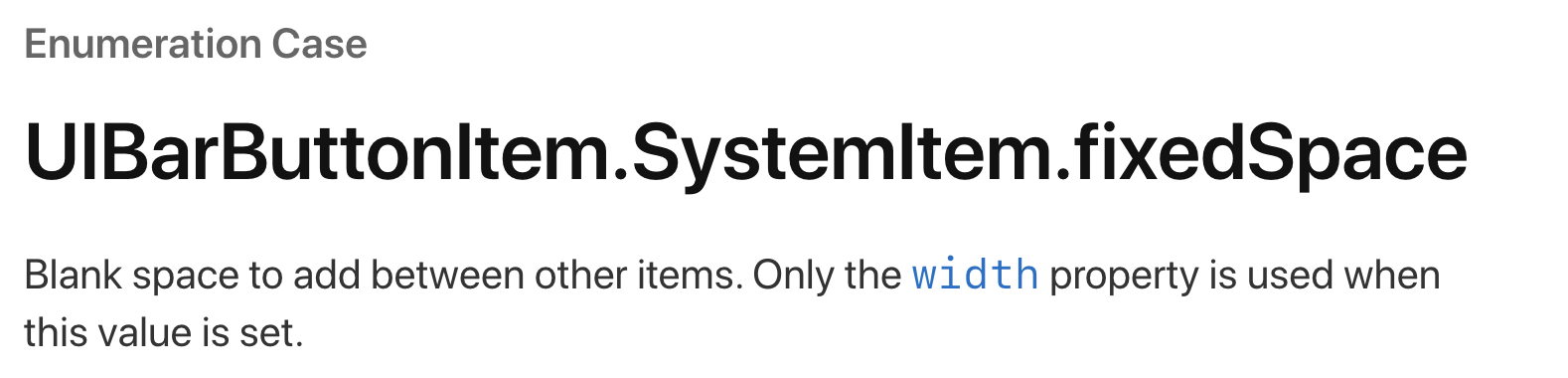 - fixedSpace는 다른 아이템과 공간을 두는 것은 flexibleSpace와 같지만 width변수에 설정한 value값만큼 옆에 있는 아이템과 거리가 멀어집니다.