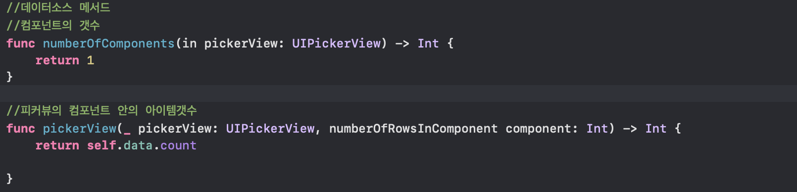 - numberOfComponents 메서드는 PickerView에 들어갈 component개수를 원하는 만큼 return 하는 것입니다.