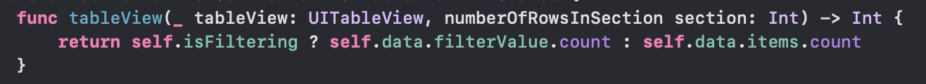 - 이제 해당 메서드의. isFiltering을 보겠습니다. 만약 text가 편집이 되면 filterValue를 반환하고 그렇지 않으면 전체 값을 나타내야 하기 때문에 items.count를 반환하게 만들어 줘야 합니다.
