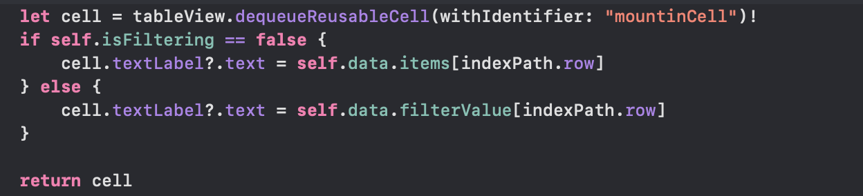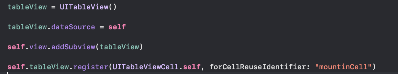 - .register(UITableViewCell.self, forCellReuseIdentifier: "mountinCell")은 programmically로 UITableView의 셀을 지정해주는 방식으로 Cell을 커스텀하지 않았으므로 UITableViewCell.self의 매개변수값을 지정해 주었고 forCellReuseIdentifier를 통해 테이블 뷰 셀의 identifier을 mointinCell로 지정을 해준 것입니다.