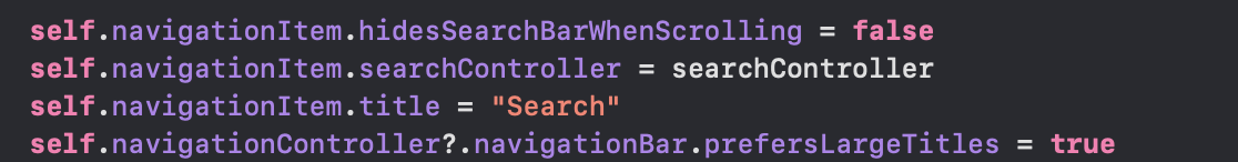 따라서 아까 설정해준 searchController객체를 여기다가 넣어줬습니다. - self.navigationController?.navigationBar.prefersLargeTitles는 navigationItem.title의 부분을 큰 글자로 넣어준 것입니다. 아래 그림을 보면. prefersLargeTitles 부분을 true로 넣어준 것입니다.