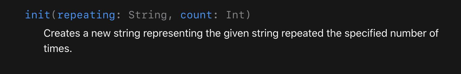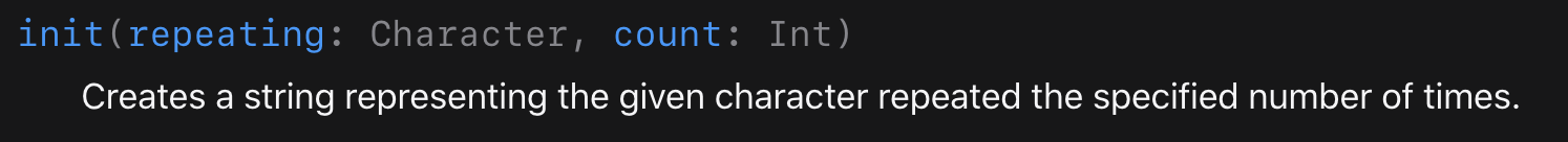공식문서에서는 count매개변수의 Int 수만큼 repeating의 문자열을 반복해서 새로운 문자열로 만들어주는 것이라고 나와있습니다.