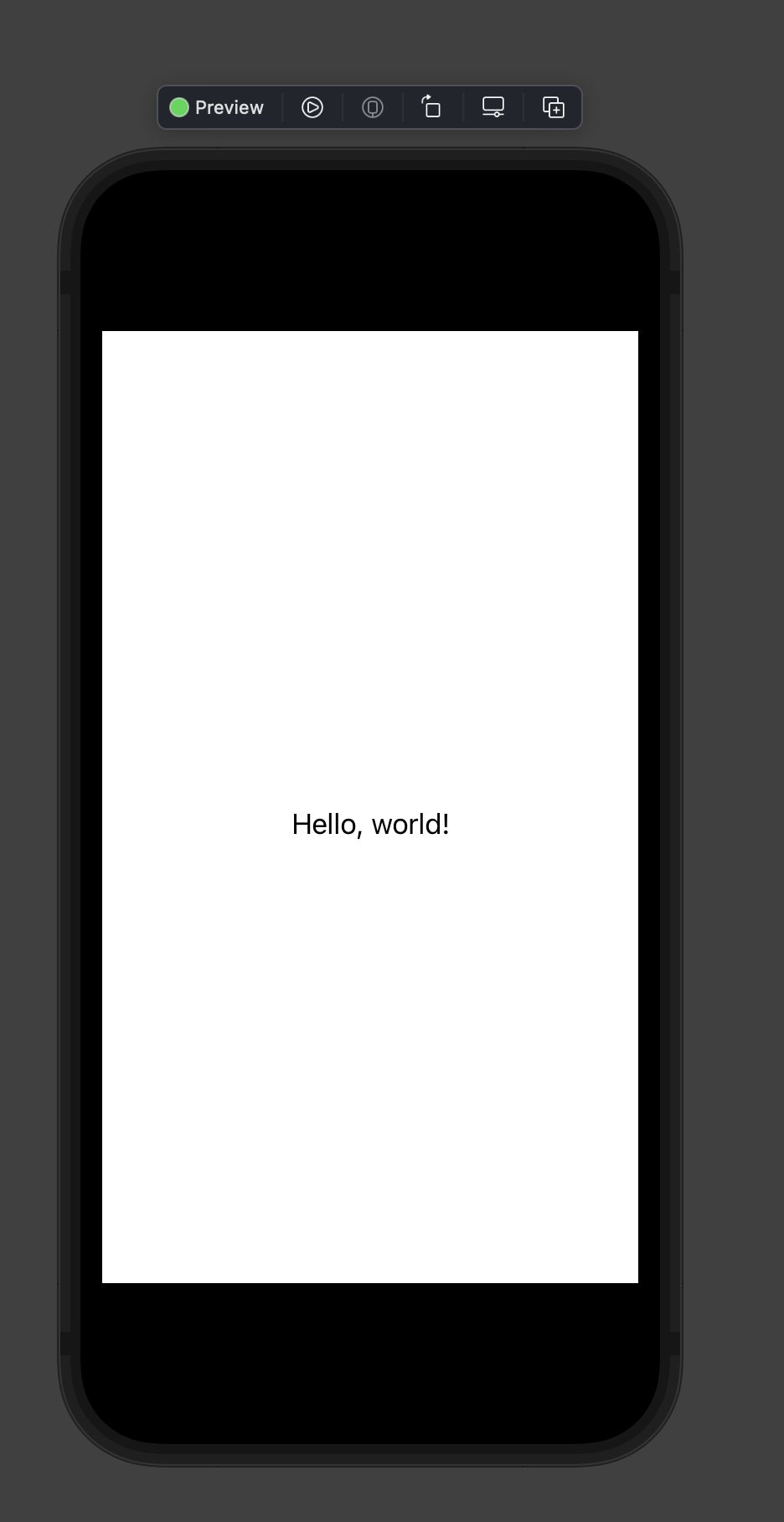 제일 처음 만들고 프리뷰 시작을 하면은 기본적으로 ContentView에 설정되어 있는 Hello, world! 가 보이는 것을 볼 수 있습니다.