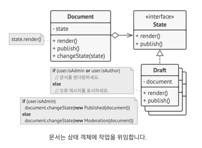 - 위 코드는 객체 내에서 자체적으로 상태에 따라 코드를 구현하는 대신 현재 상태를 나타내는 상태 객체중 하나에 대한 참조를 저장하고 모든 상태에 관련된 작업을 Document 객체에 위임하는것입니다.
