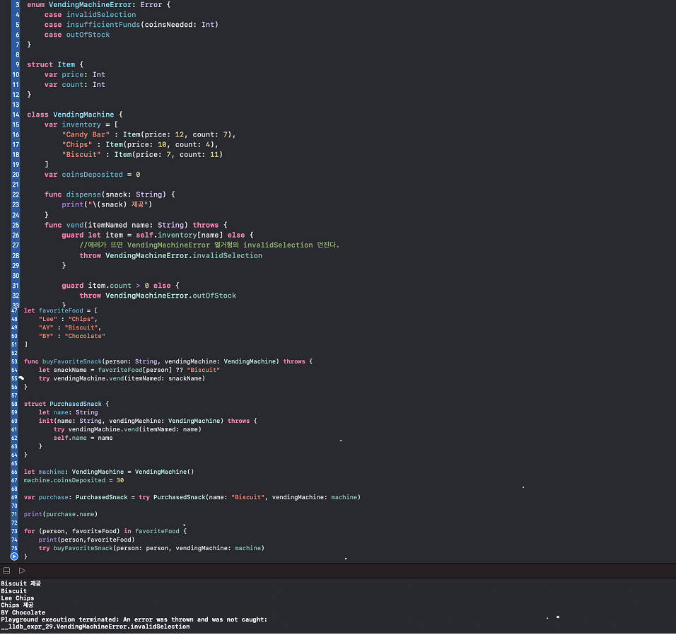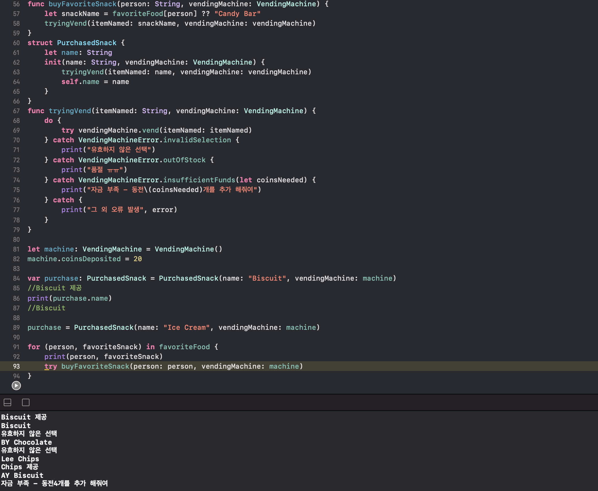 * vend 메서드는 오류를 던질 가능성이 있으므로 vend를 호출하는 함수인 buyFavoriteSnack함수와 구조체 PurchaseSnack의 이니셜라이저도 throw 키워드를 통해 오류를 던질 가능성이 있음을 표시해줍니다.