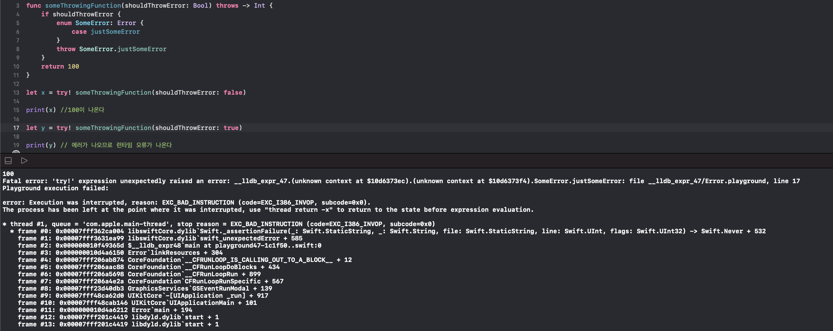 * 첫 번째 x변수의 try는 에러가 발생하지 않았으므로 Optional이 벗겨진 100으로 출력하는 것을 볼 수 있지만 두 번째 y변수는 error코드가 return 되므로 런타임 오류가 발생한 결과를 아래 출력 참에 Fatal error를 통해서 확인할 수 있습니다.