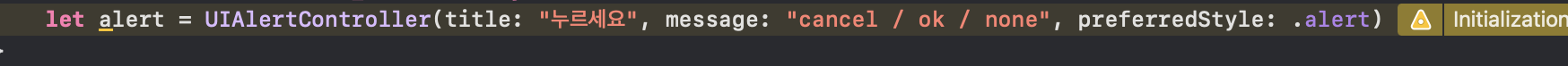 - 이제 UIAlertAction을 통해 버튼 객체까지도 생성해 주었습니다. 이 객체를 UIAlertController객체에 추가해주겠습니다.