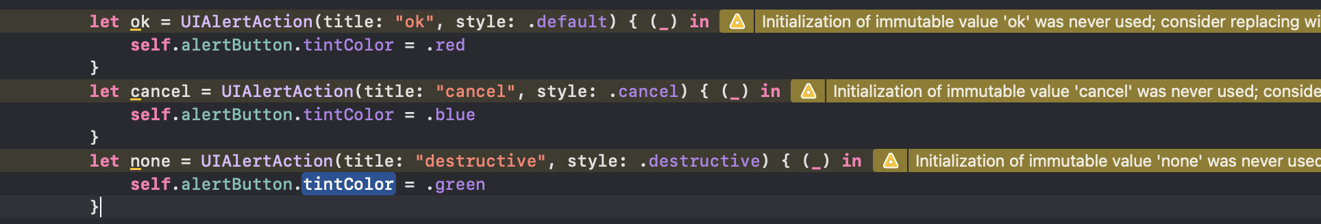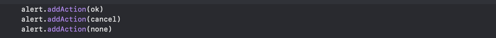 - 총 3개의 UIAlertAction(버튼 객체)를 추가해 주었으므로 3개의. addAction을 해줘야 합니다.