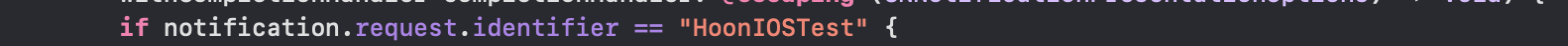 - 앞 포스팅에서 UNMutableNotificationContent객체의 userinfo에 식별 아이디를 HoonIOS로 입력을 했기 때문에 여기서는 사용자가 클릭했을 때 알림 메시지를 식별할 수 있게 해 주는 것입니다.