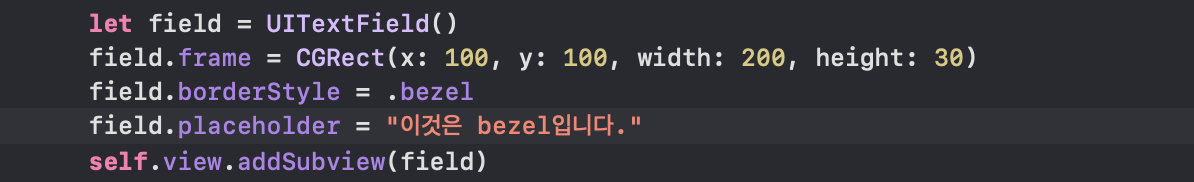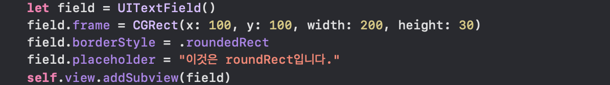 ※ 여기서 설명된 코드는 공통적으로 UITextField객체를 생성해주고 객체의 위치를 지정해 주는. frame과 테두리 스타일을 지정해주는. borderStyle 고나 텍스트 필드 안에 표시될. placeholder을 지정해준 것입니다.