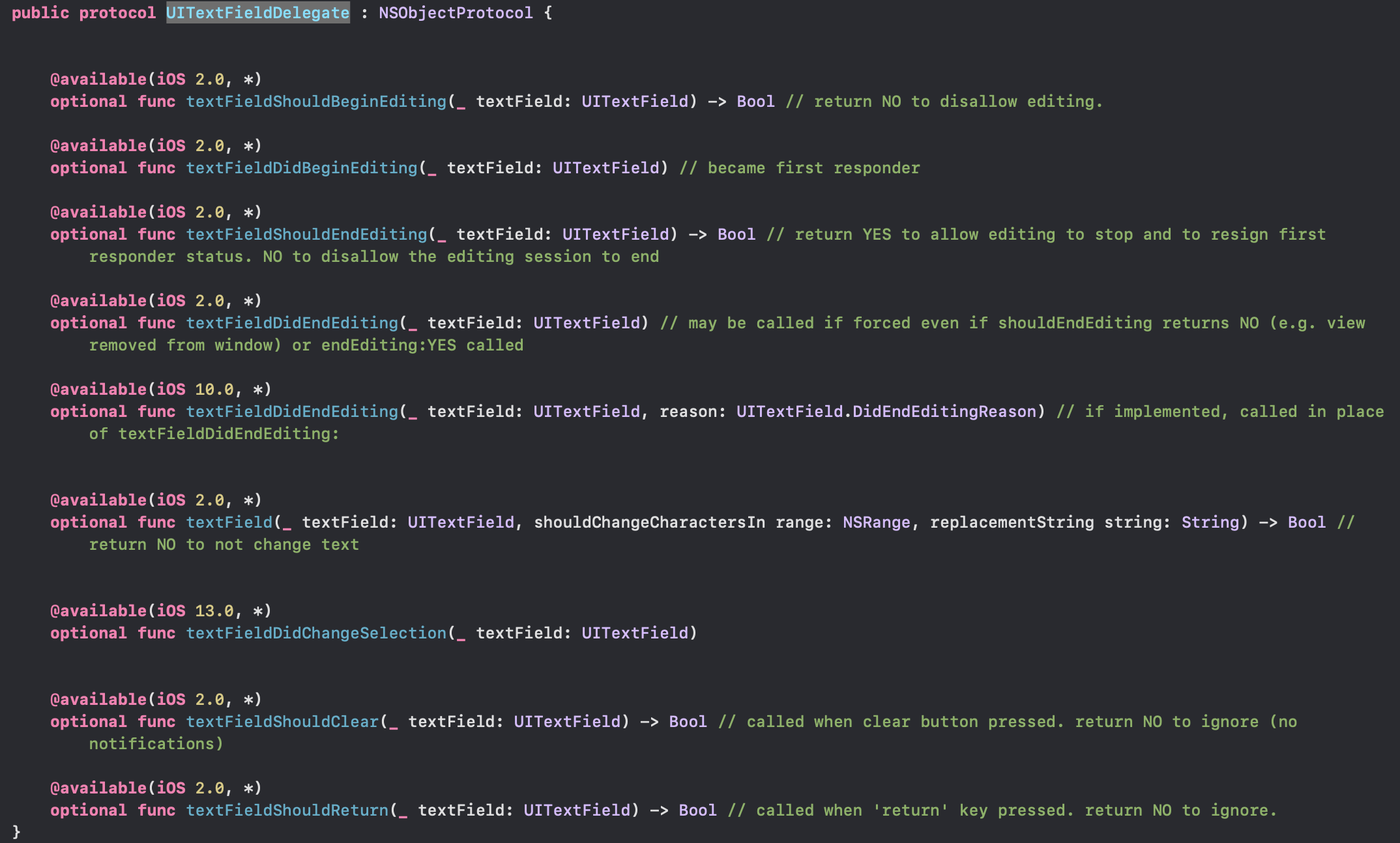 ※ UITextFieldDelegate의 메서드 선언한 것을 한번 보겠습니다.