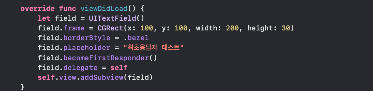 - 그런데 여기서 func textFieldShouldReturn(_ textField:) -> Bool 메서드가 있습니다. 이 함수는 텍스트 필드의 델리게이트 메서드로 return키를 누르게 되면 실행되는 메서드입니다. 따라서 리턴키를 누르면 최초 응답자를 뺏어가는 형태의 코드를 작성한 것입니다.