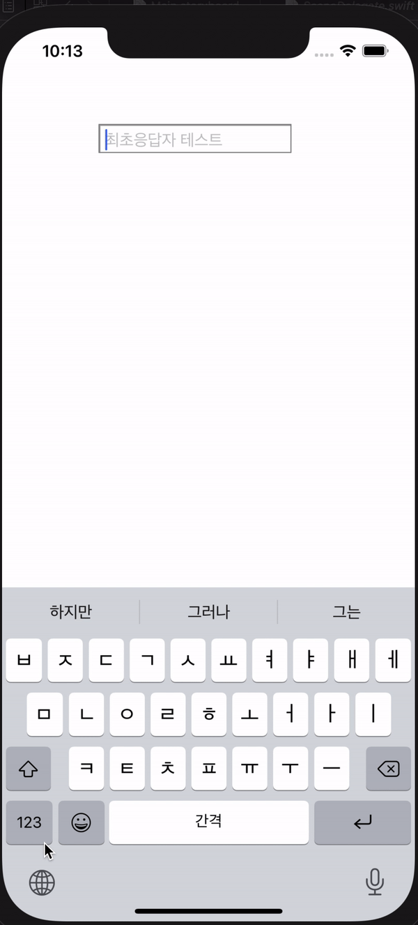그럼 이제 이 텍스트 필드에서 최초 응답자로 만들어 앱이 켜지자마자 키보드가 실행되게 자동으로 텍스트 필드는 최초 응답자인 경우를 봐보겠습니다.