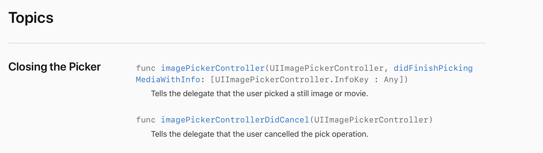 이제는 이미지 피커 컨트롤러에 이벤트를 발생했을 때 수행하는 작업을 하는 이미지 피커 컨트롤러의 델리게이트 메서드에 대해 알아보겠습니다.