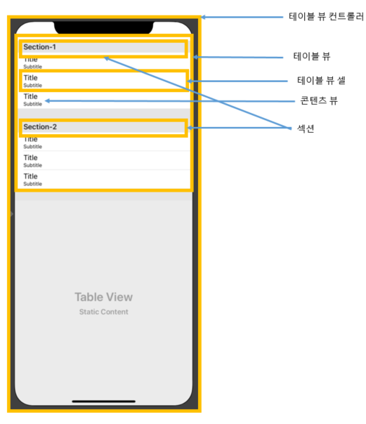 테이블 뷰 컨트롤러의 계층은 이렇게 씬, 테이블 뷰 컨트롤러, 테이블 뷰, 테이블 뷰 셀, 콘텐츠 뷰가 있습니다. 이제 하나씩 알아보겠습니다.