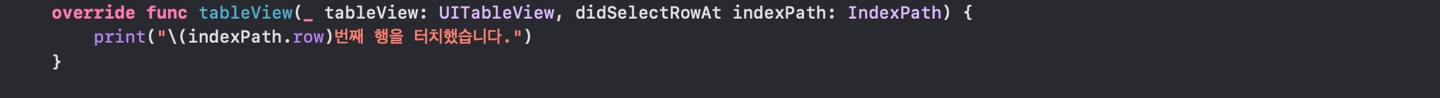 - tableView(_:didSelectRowAt:) 메서드는 테이블 뷰셀을 터치했을 때 발생하는 메서드로 UITableViewDelegate에 구성되어 있습니다.