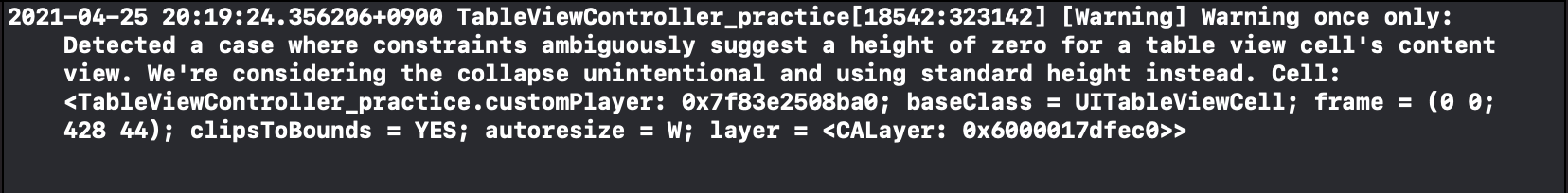 자 이제 앱을 실행해 볼까요? 실행은 되지만 앱을 실행할 때마다 테이블 뷰 셀들의 높이를 잡아주라고 아래와 같이 경고창이 뜨네요