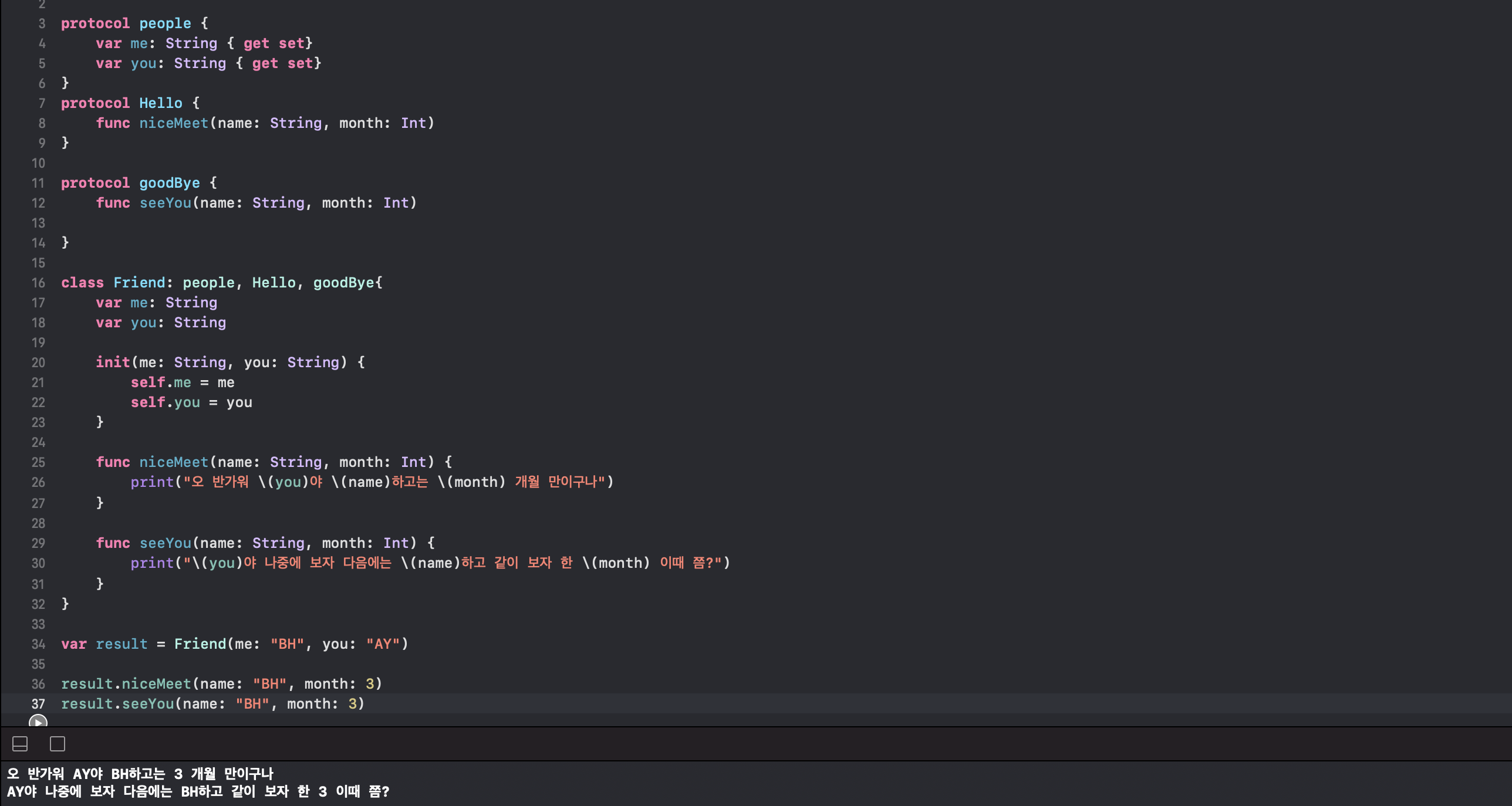 - people프로토콜에는 me, you 변수를 읽기 전용으로 구현을 해줬고 Hello 프로토콜, goodBye 프로토콜에는 함수를 구현해줬습니다.