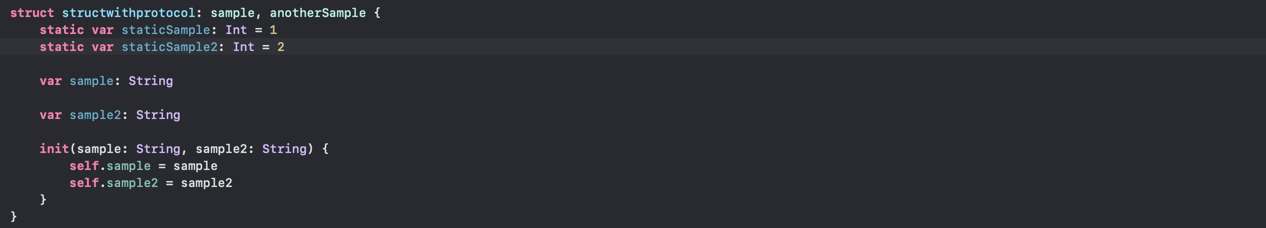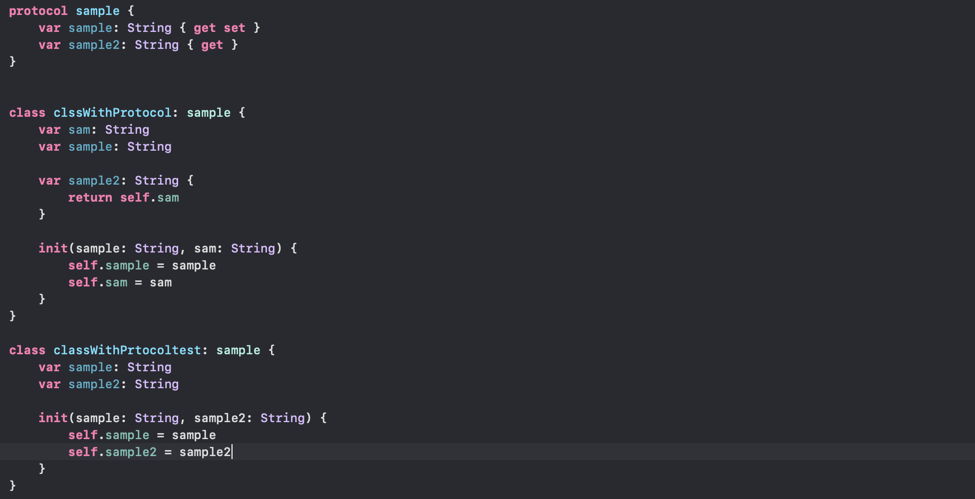 - sample 프로토콜에 sample 읽기 쓰기 가능한 sample 변수와 읽기만 가능한 sample2 변수를 구현해줬습니다.