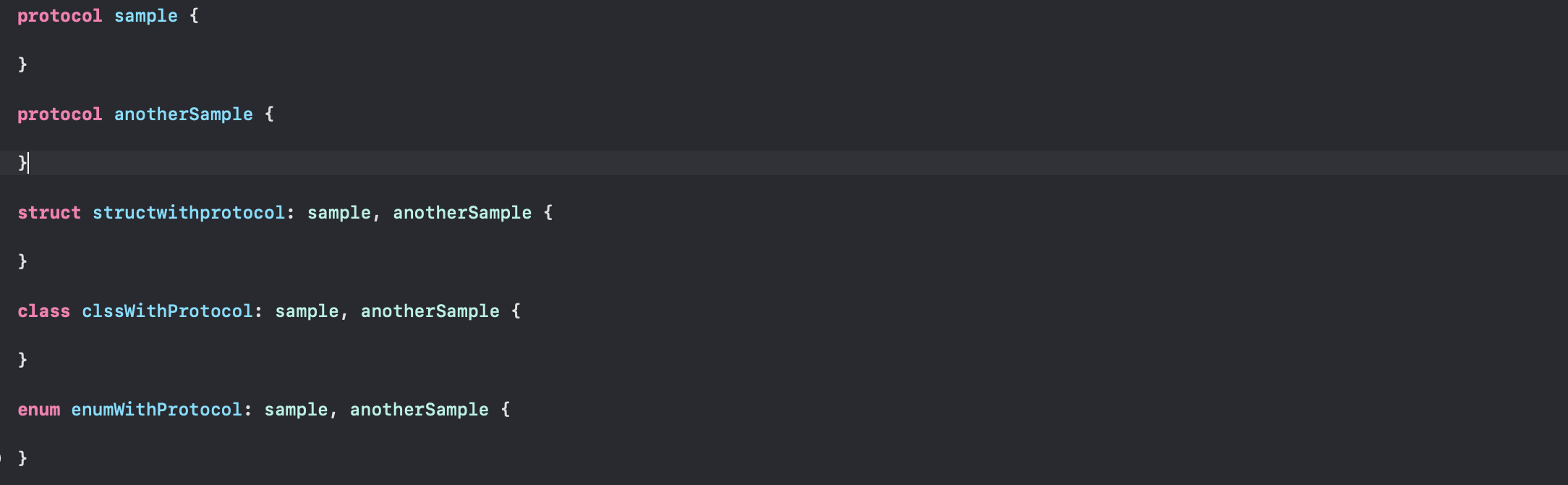 - 위에 코드를 보시면 샘플 프로토콜 2개를 명시해주고 각 구조체, 클래스, 열거형에 프로토콜을 명시해준것을 볼 수 있습니다.