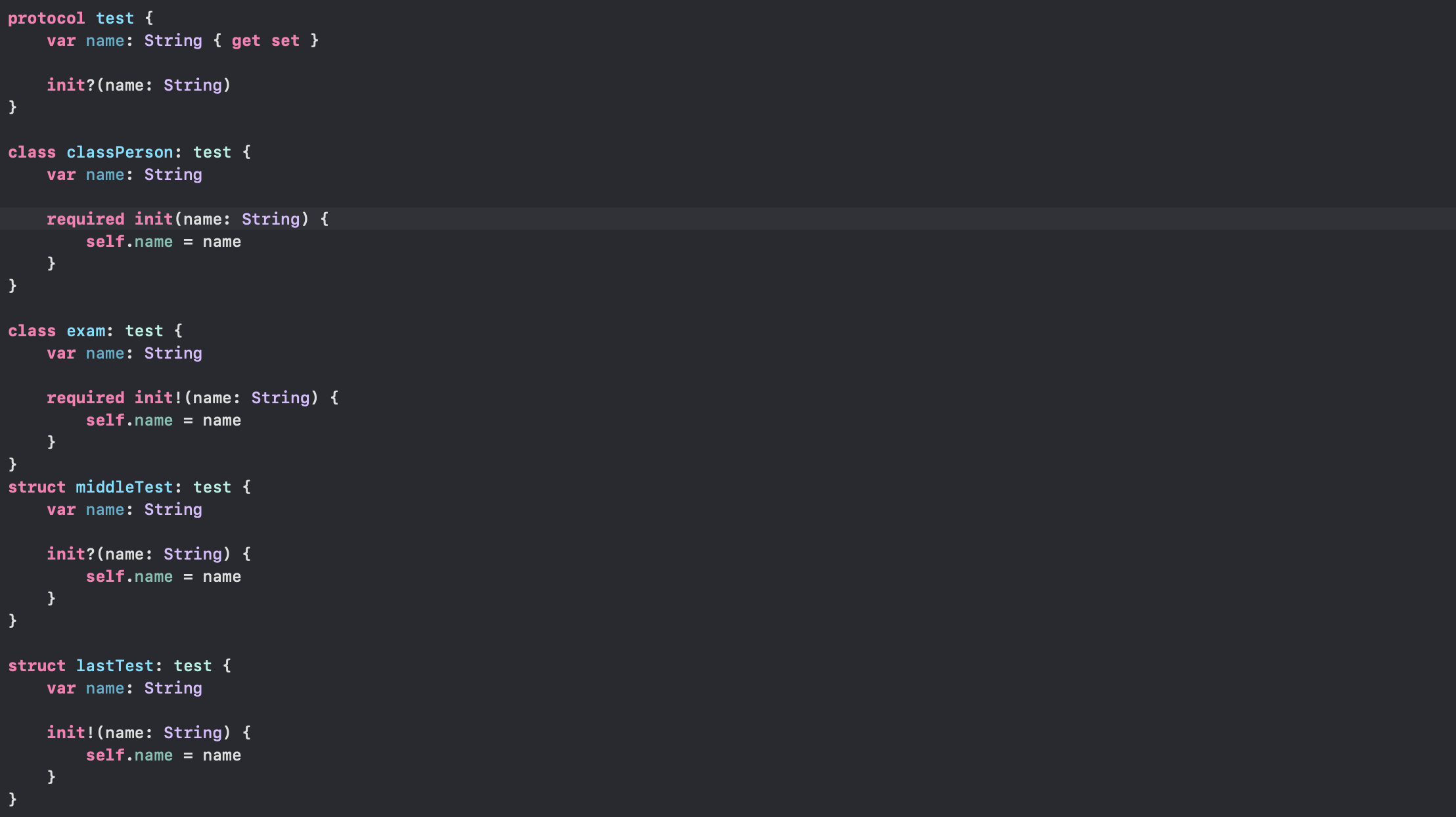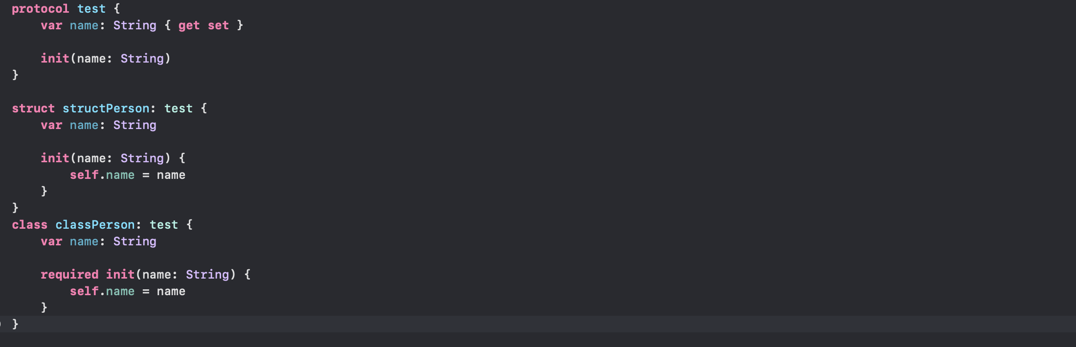 - classPerson클래스에 test프로토콜을 구현받았지 않았지만 이미 해당 클래스 안에 test 프로토콜에 해당하는 변수랑 이니셜라이저가 정의되어 있습니다.