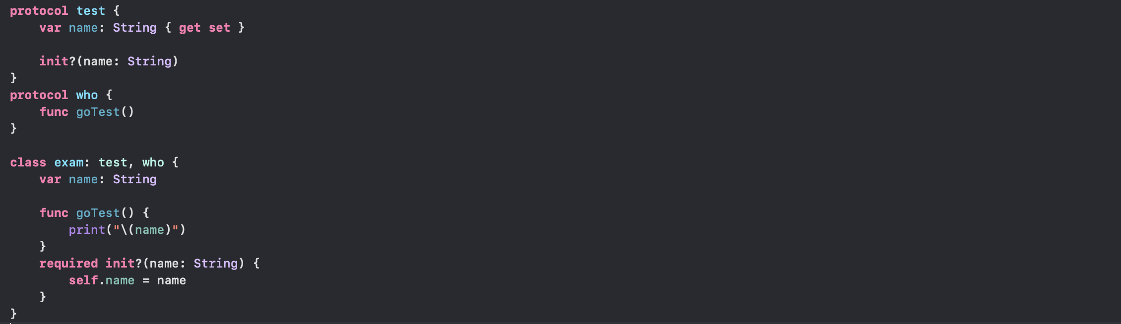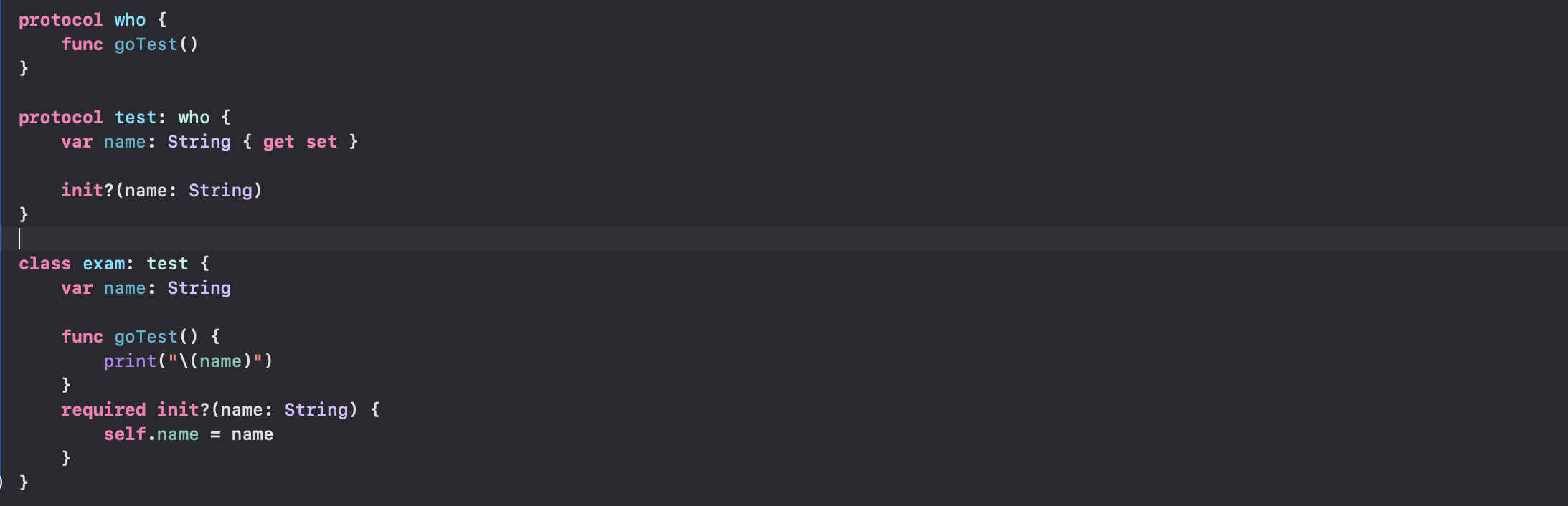 - who 프로토콜을 상속받은 test프로토콜을 exam에 상속을 시켜줘서 클래스에 구현을 해줬습니다.