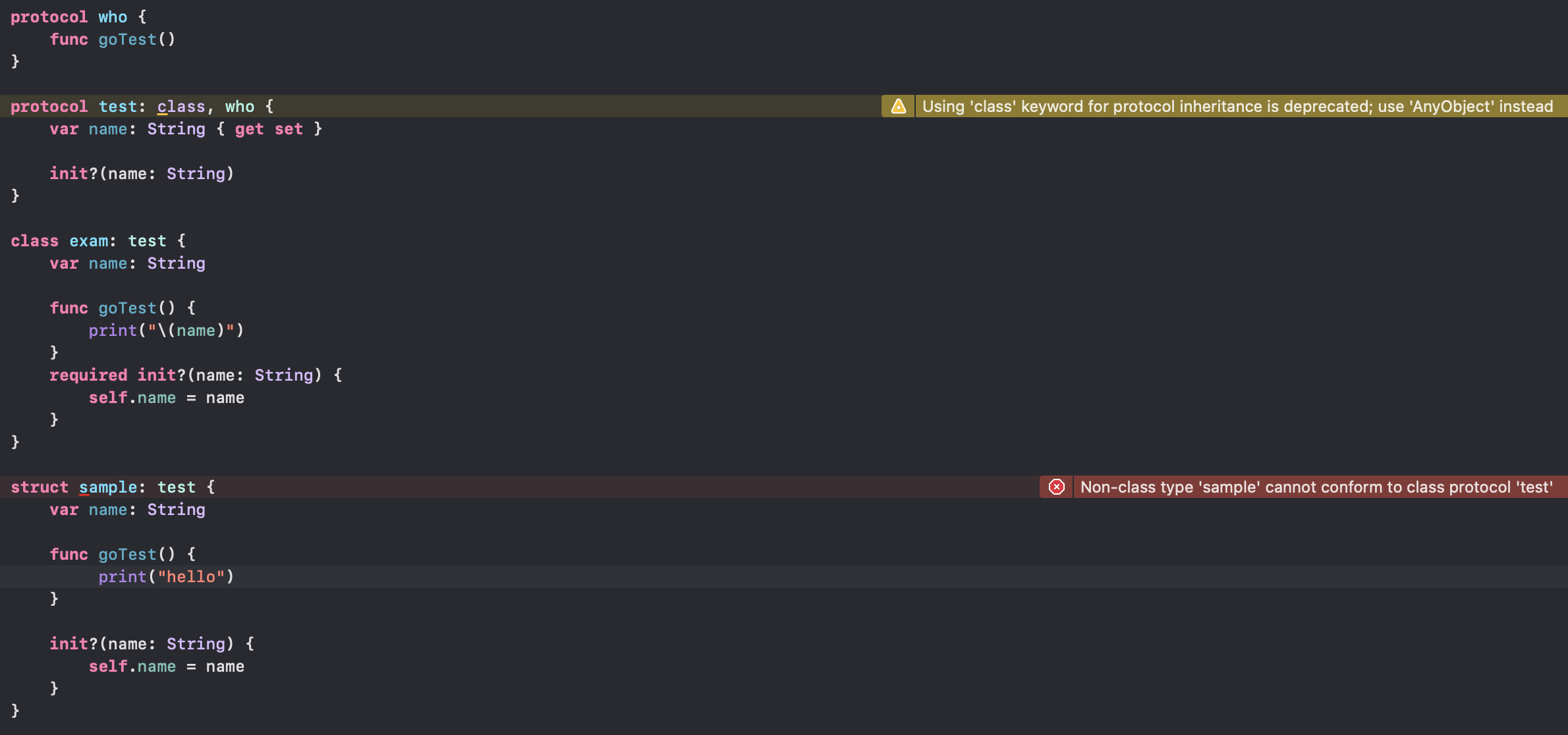 - 따라서 이 프로토콜을 구조체인 sample에 구현을 시키면 에러가 발생하게 됩니다.