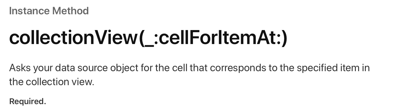 이 메서드도 tableViewController에서 많이 봤던 메서드입니다. 테이블 뷰 컨트롤러에서 테이블 뷰 셀을 구성하기 위한 메서드였는데요 컬렉션 뷰에서도 같이 사용을 합니다.