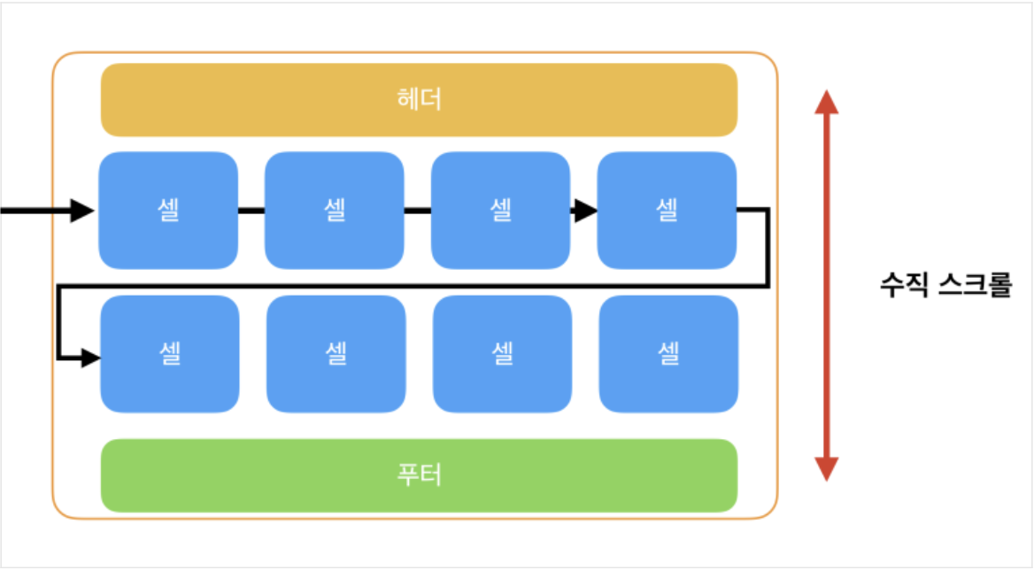 - 이 레이아웃은 왼쪽에서 오른쪽으로 셀들을 추가하고 공간이 부족하면 다음 행으로 넘어가 처음부터 채우는 방식입니다.