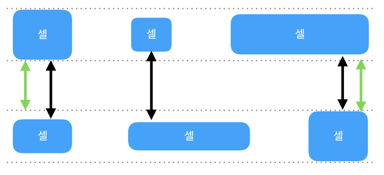 - .minimumLineSpacing속성은 아래 그림에서 연두색 같이 위 아래 셀들간의 최소 간격을 설정해주는것을 말합니다.
