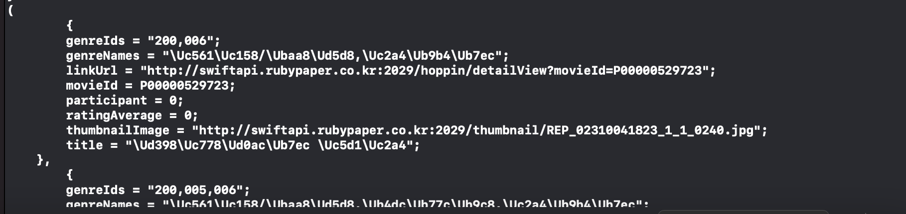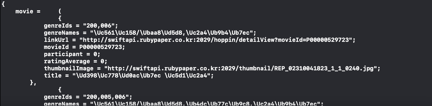 그 이유는 위에서 movie는 JSON배열로 되어 있어 NSArray타입으로 캐스팅을 해줬지만 하나의 JSON배열 안에 값들은 JSON객체로 되어있어 딕셔너리 형태로 되어있어 하나의 배열 값들을 NSDictionary로 캐스팅해줘야 합니다.