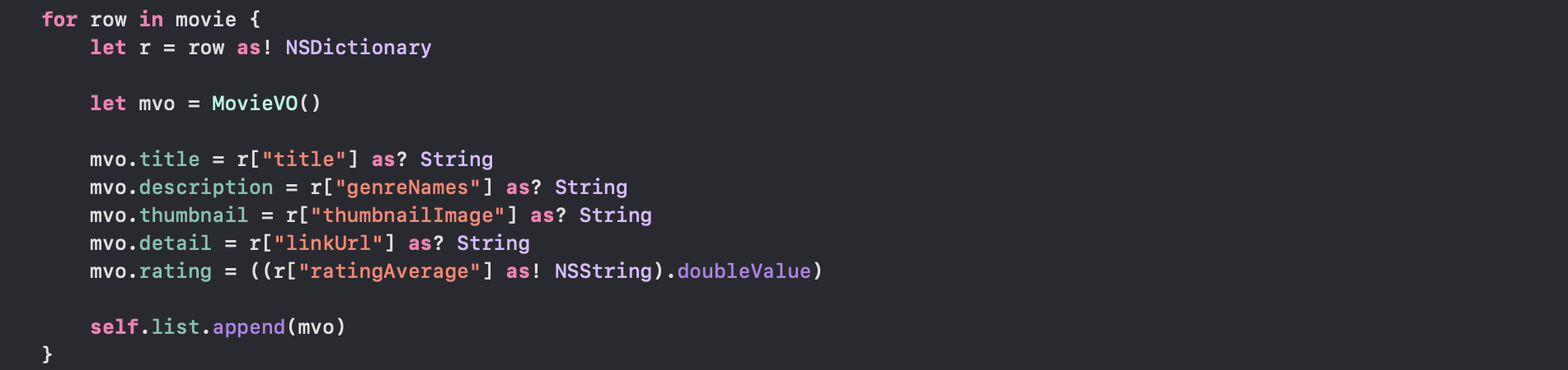 - movie 배열값 즉 NSArray로 캐스팅했던 JSON 값들을 MovieVO인 모델 클래스 값에 넣어서 해당하는 변수 값에 값을 넣어주고 list 배열에 그 객체 값들을 하나씩 넣어줬습니다.