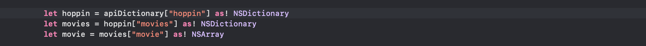- hoppin으로 시작하는 노트는 딕셔너리 타입이며로 NSDictionary타입으로, movies로 시작하는 하위 노드도 딕셔너리 타입이므로 NSDictionary로 movie는 JSON배열 타입이므 선언이 되었기 때문에 NSArray타입으로 캐스팅을 해줬습니다.