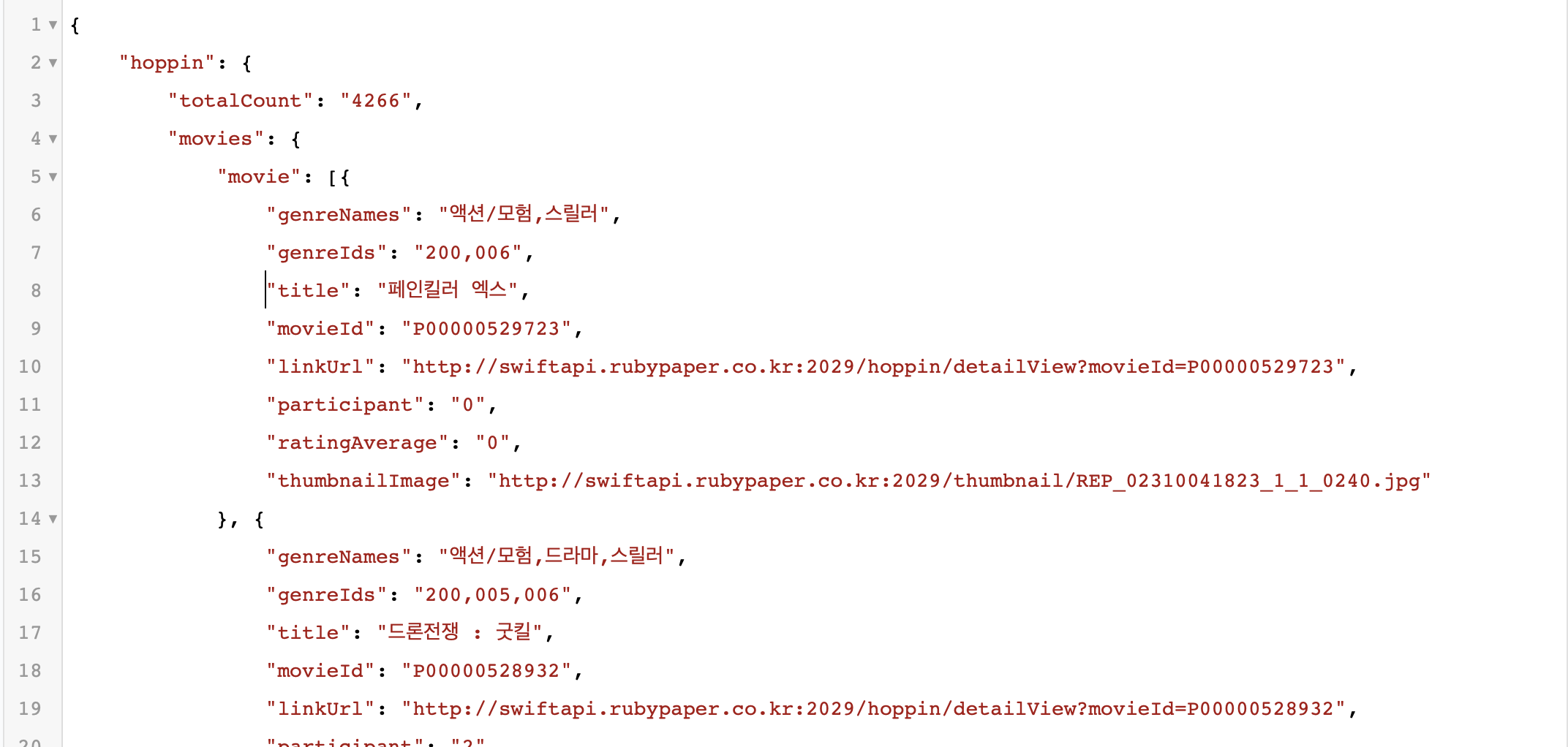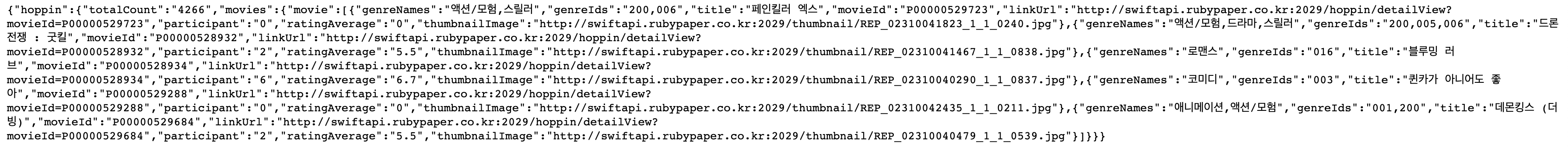 형태를 보면 JSON형태로 되어있는 것을 보실 수 있는데 뭐라고요 잘 안 보인다고요? 키가 hoppin, totalcount, movie로 되어있어 이 형태를 한번 보시면 되실것 같습니다.