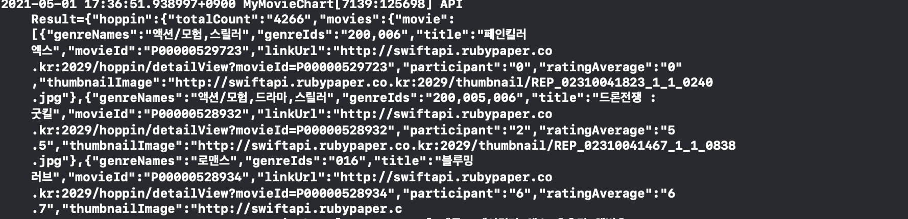 이번에 사용할 API는 https://swiftapi.rubypaper.co.kr:2029/hoppin/movies?version=오픈API버전&count=불러올 개수&page=불러올페이지&version=오픈API버전 입니다.