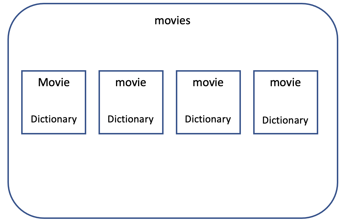 hoppins키가 빠진 값들이 읽어온 것을 확인할 수 있습니다. - movies키 값으로 딕셔너리 값을 가져오면 다음과 같은 값을 가져오게 됩니다.