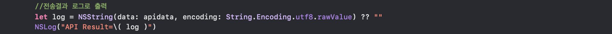 - NSString 타입으로 data타입으로 받은 데이터를 문자열로 변환하는 과정입니다.