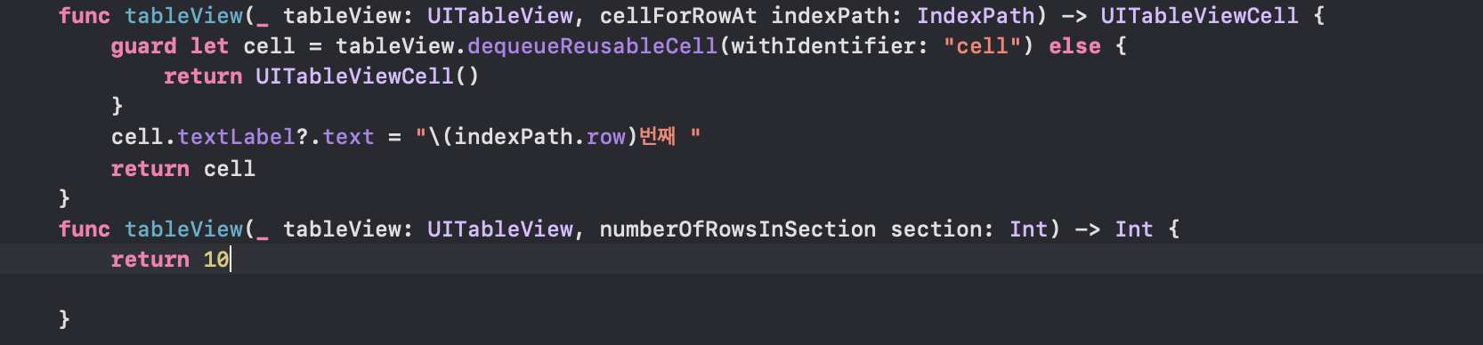 - 여기서 특이한 점은 tableViewController에서 델리게이트, 데이터 소스 메서드를 구현해줄 때 override를 붙여줬었지만 테이블 뷰에서 구현을 할 때는 붙여줄 필요가 없다는 것입니다.