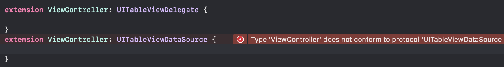 ( 테이블 뷰 컨트롤러에서는 이미 delegate와 datasource를 받아 구현되어 있지만 여기서는 뷰 컨트롤러를 받았으므로 2개의 프로토콜을 구현해야 합니다. ) - 여기서 Datasource 구현해준 부분에 에러가 났는데요, 이 부분은 UITableViewDataSource 프로토콜에서의 필수 메서드를 구현해주지 않았기 때문에 구현해주면 사라지는 에러이므로 신경 안 쓰셔도 됩니다.