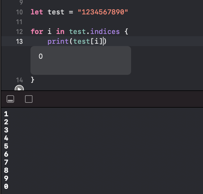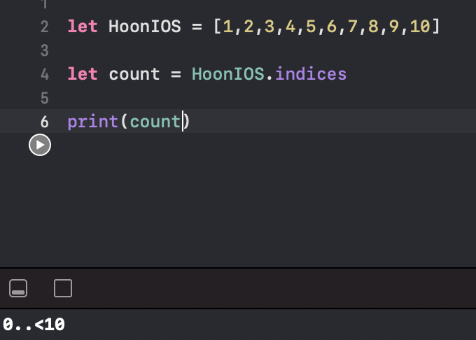 근데 indicies를 공부하다가 새로운것을 또 발견했는데요, 애플 문서를 보니 String값을 indices해준 다음 해당 인덱스를 String배열에 넣으니 그 값들이 출력을 하는 것이었습니다.