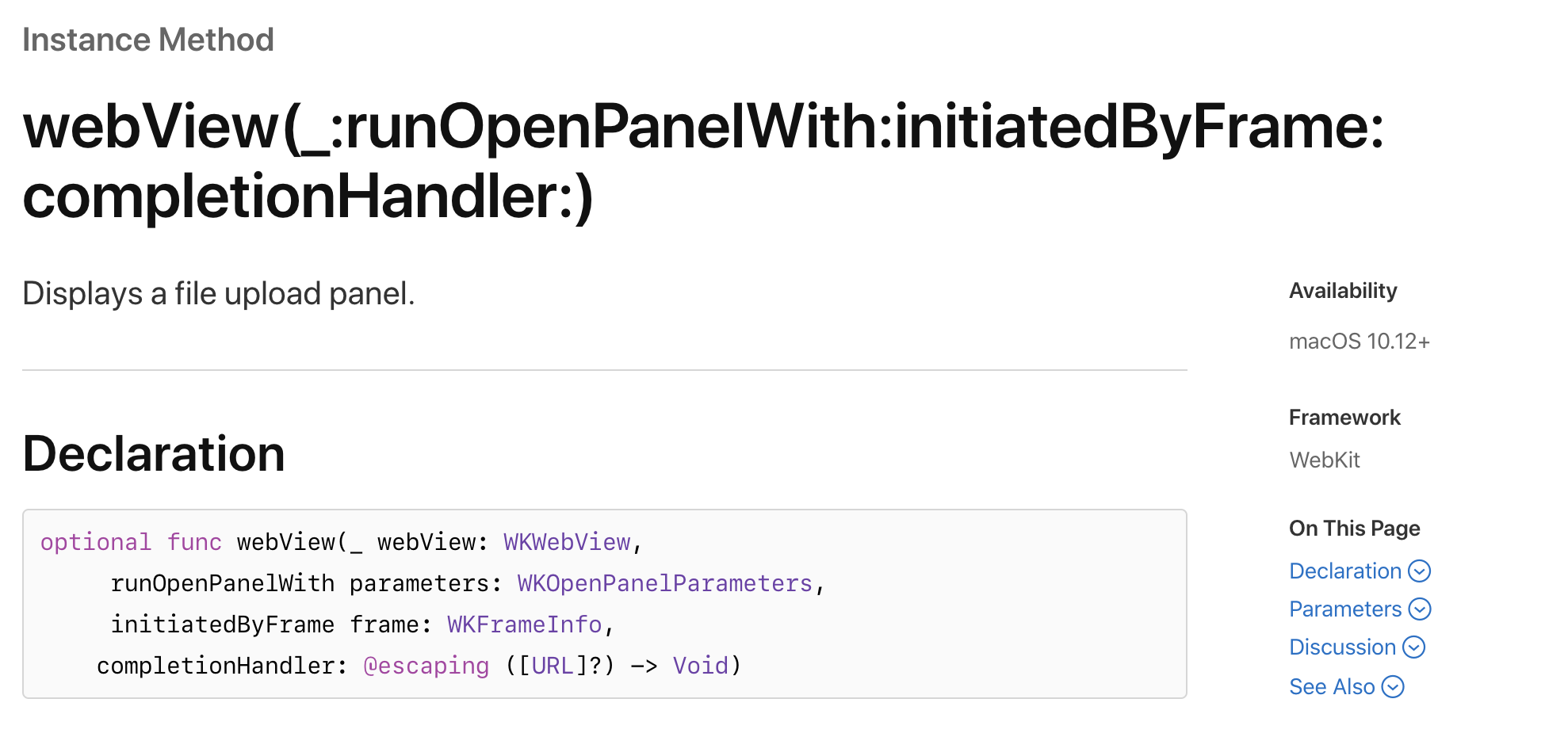 webView(_:runOpenPanelWith:initiatedByFrame:completionHandler:)