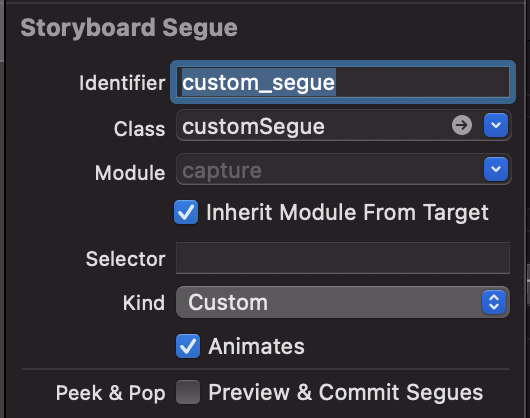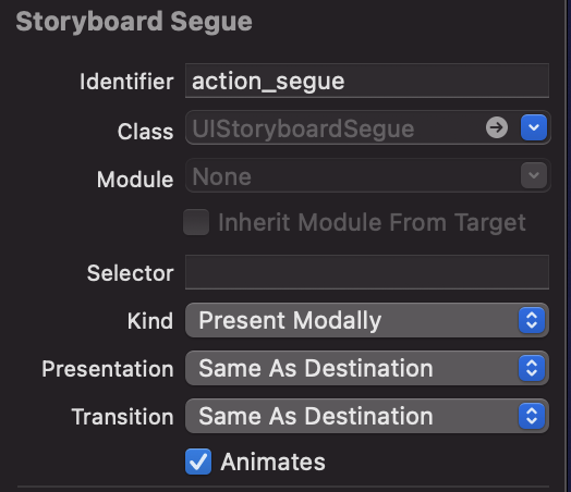 - Next 버튼의 커스텀 세그웨이 identifier를 custom_segue로 지정해주고 presentSegue 버튼의 세그웨이 identifier를 action_segue로 지정을 해줍니다.