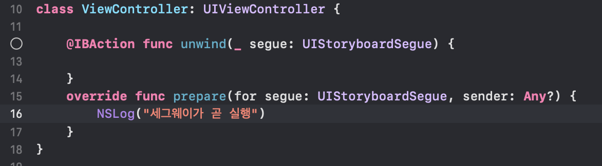 - 아래 사진은 prepare를 재정의 해주어 화면 전환 실행 전에 Xcode 콘솔 창에 log가 찍히도록 NSLog를 정의해주었습니다.
